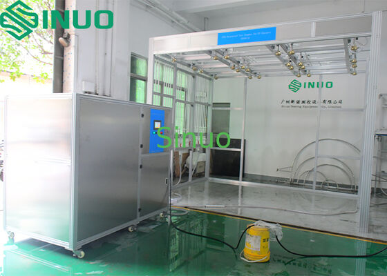 During the rain test, the control panel sends a signal to start the system. The water pump draws water from the water tank into the pipeline spray system. After flow and pressure adjustment, the system generates the required rainfall (each nozzle: 10 L/min). Water is sprayed onto the sample surface through IPX4 standard nozzles with adjustable angles.